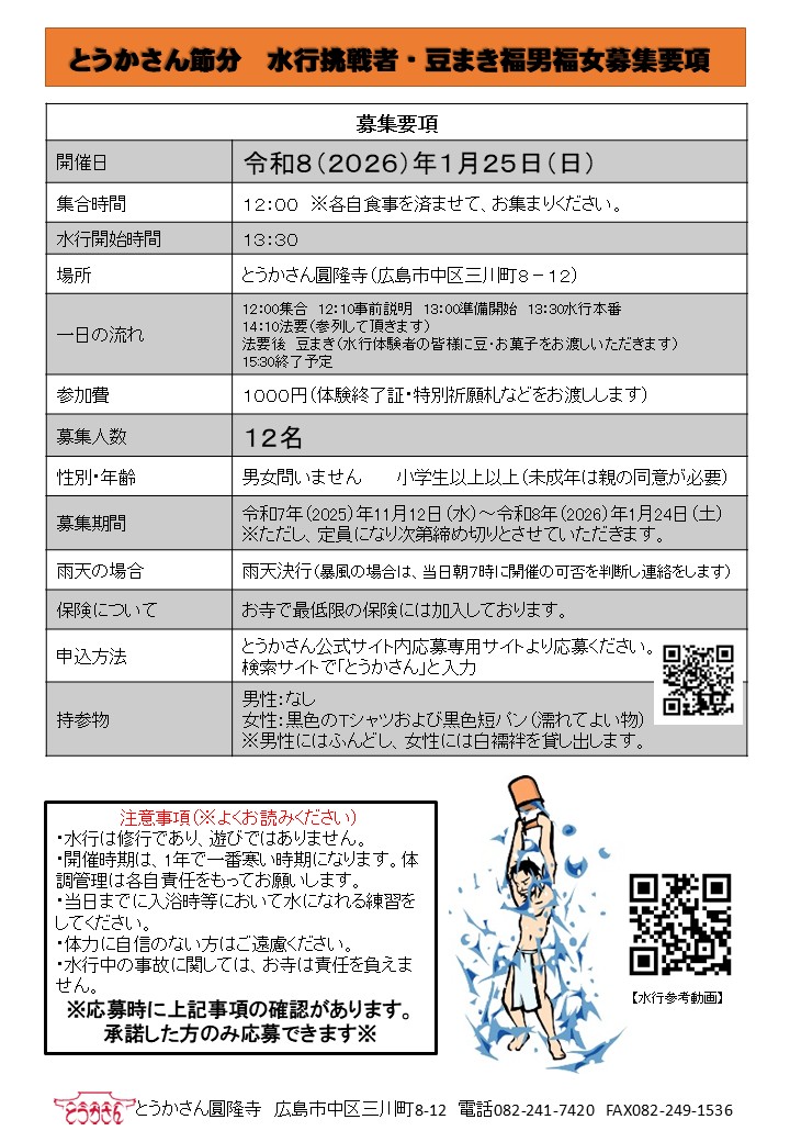 募集 【募集】1月25日節分会 水行体験について 2025.11.12 令和8年(2026)1月25日開催予定の節分会に合わせて、今年も水行体験の挑戦者を募集します。 要項は下記に記載しておりますので、ご覧ください。 応募は、下の専用応募フォームからお申し込みください。 水行応募専用フォーム 不明な点は、とうかさん圓隆寺(082-241-7420)までご連絡ください。 Post Share Hatena Pocket RSS feedly Pin it 記事一覧 中谷康韻(こういん) とうかさん圓隆寺の住職 1984年生まれ A型 【行事告知】第744遠忌宗祖報恩お会式 関連記事 とうかさん大祭の紹介映像が完成しました Webサイトリニューアルのお知らせ 住職 新入社員研修講演 令和7年秋彼岸法要のご案内 令和7年度大祭時の中央通り周辺の交通規制のお知らせ 令和7年お盆送り火法要のご案内