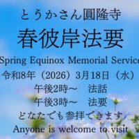 告知 【行事告知】令和8年度 春のお彼岸法要 2026.3.8 【行事告知】 令和8年のお彼岸法要が以下の通りに行われます。 日にち:令和8年(2026)3月18日(水) 時間:14時~ 法話 15時~ 法要 どなたでもご参加いただけます。 卒塔婆の申し込みや、ご不明な点は圓隆寺(082-241-7420)までご連絡ください。 Post Share Hatena Pocket RSS feedly Pin it 記事一覧 中谷康韻(こういん) とうかさん圓隆寺の住職 1984年生まれ A型 【募集】1月25日節分会 水行体験について 関連記事 三木大雲の怪談説法のチケットについて Webサイトリニューアルのお知らせ 【行事報告】第744遠忌宗祖報恩お会式 令和7年秋彼岸法要のご案内 令和7年度(2025年)とうかさん大祭告知映像 公開のお知らせ 2025年9月20日開催 三木大雲の怪談説法のお知らせ